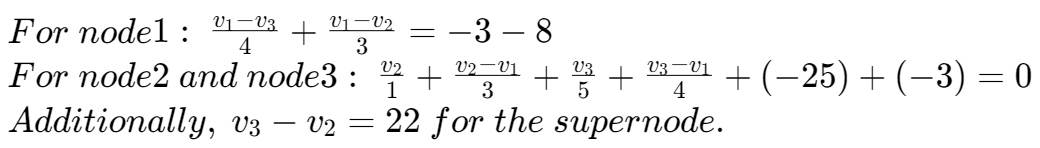 对于存在电压源的电路,由于经过电压源的电流无法计算,则将电压源两侧的节点视为一个节点,此节点为超节点(supernode)。